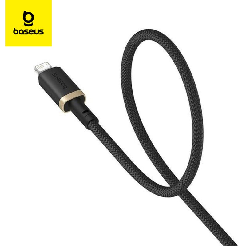 Câble USB vers Lightning Baseus au design élégant noir et or, compatible avec la charge rapide 20W pour iPhone et iPad. Longueur 1 mètre
